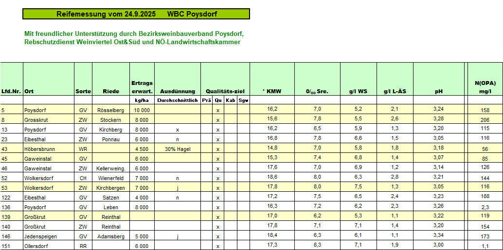 Reifemessung vom 24. September 2025 Veröffentlicht am 24. September 2025 von B.Spaeth Die achte Messung des Jahres 2025: der Vergleich mit den Vorjahren beim Grünen Veltliner: